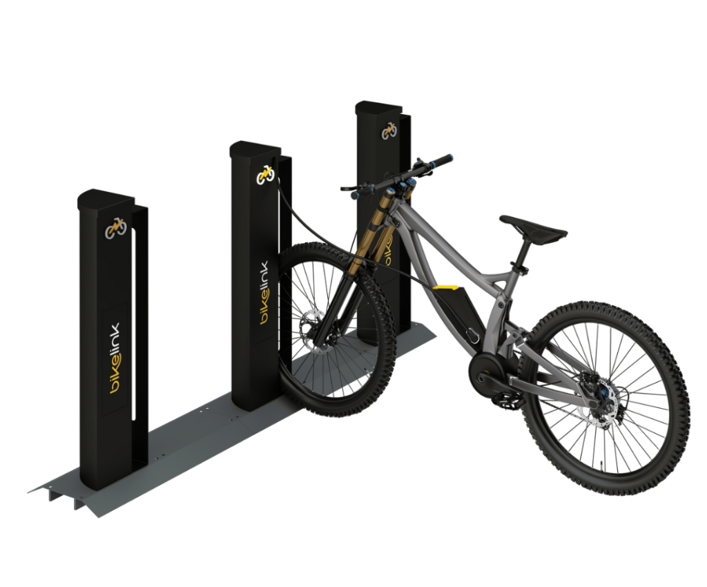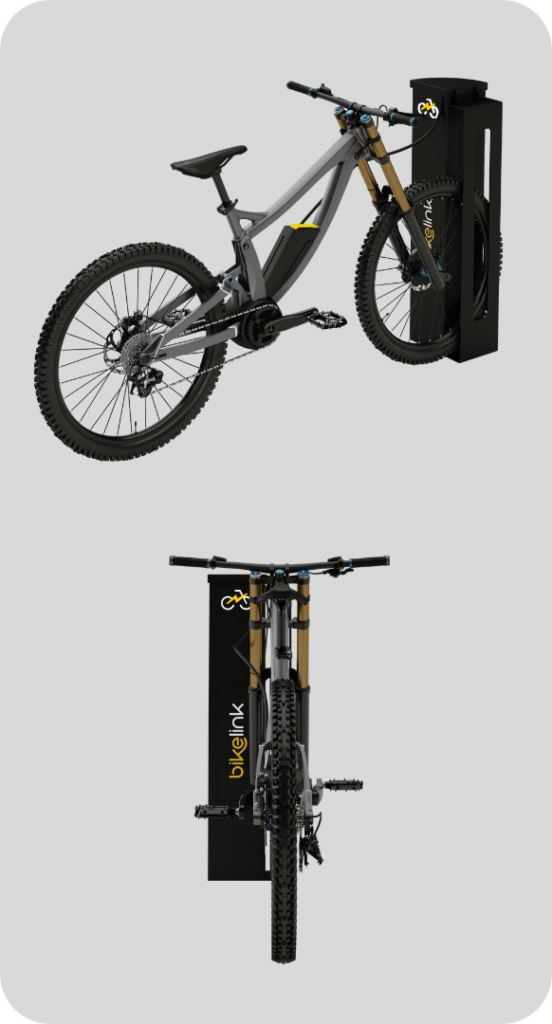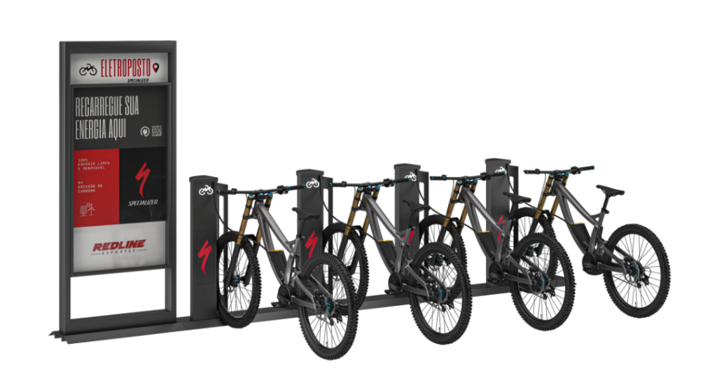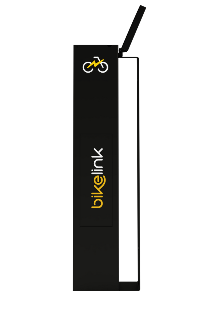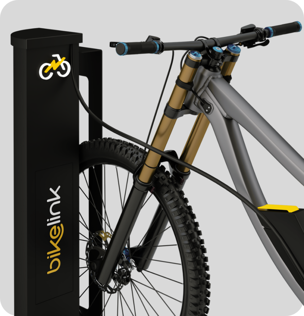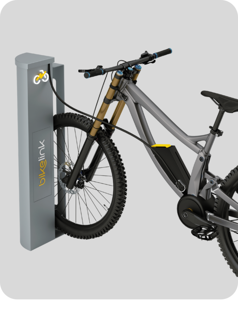 Paraciclo com sistema elétrico completo. Compacto, seguro e com tomada inteligente. Funciona com energia renovável certificada. Emissão zero de carbono.
